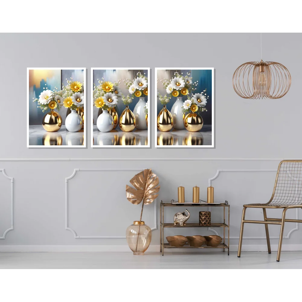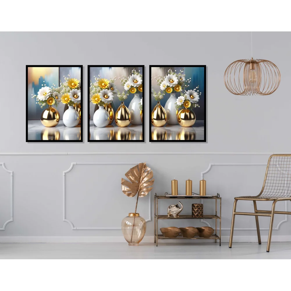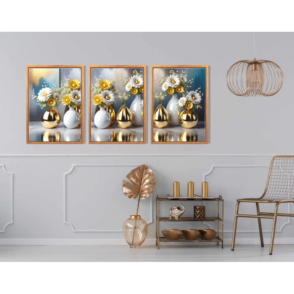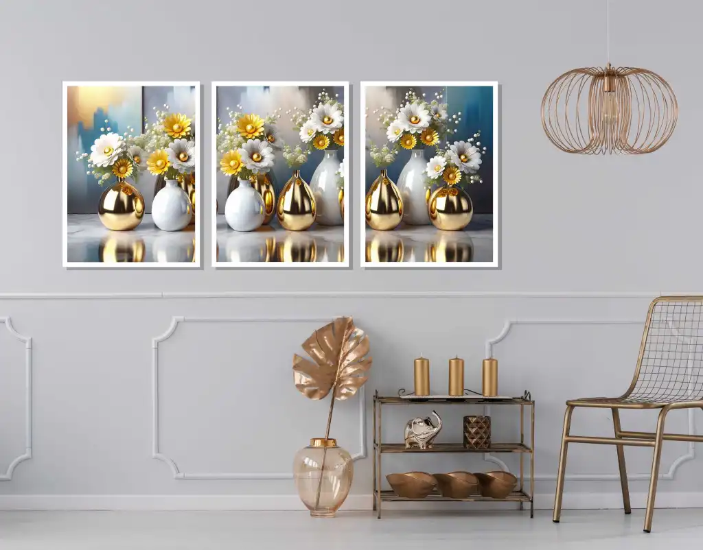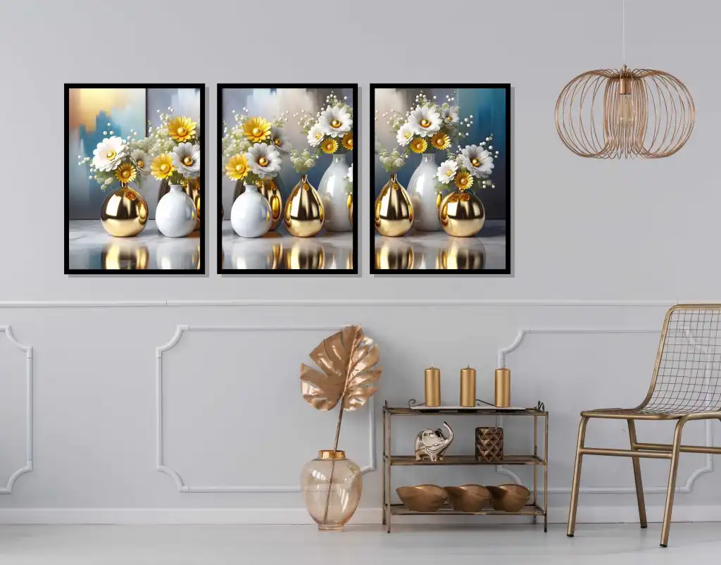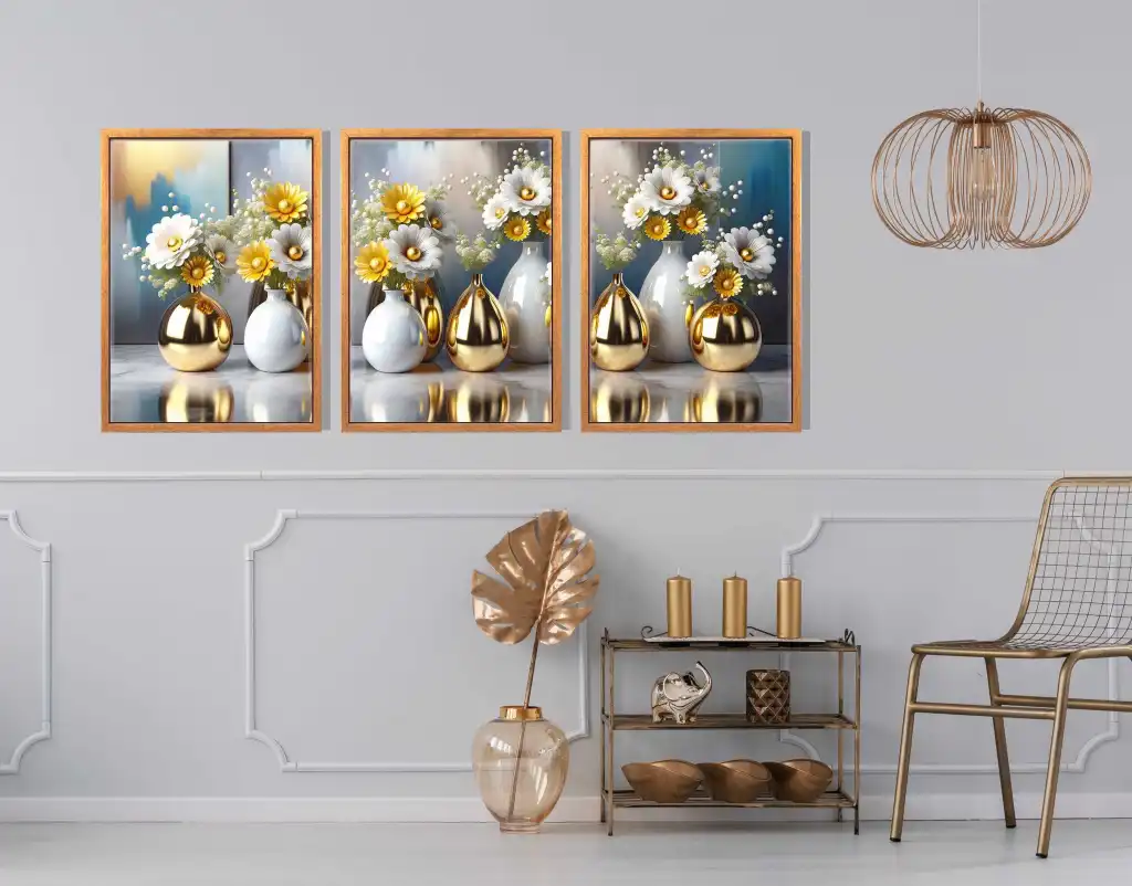 3 Parça Çerçeveli Vazoda Çiçekler Ahşap Tablo seti, Ev Dekoru