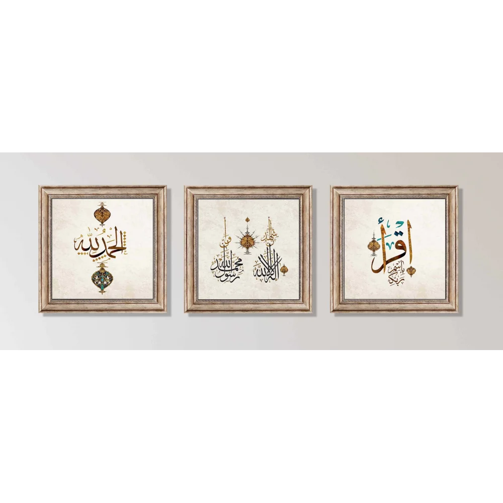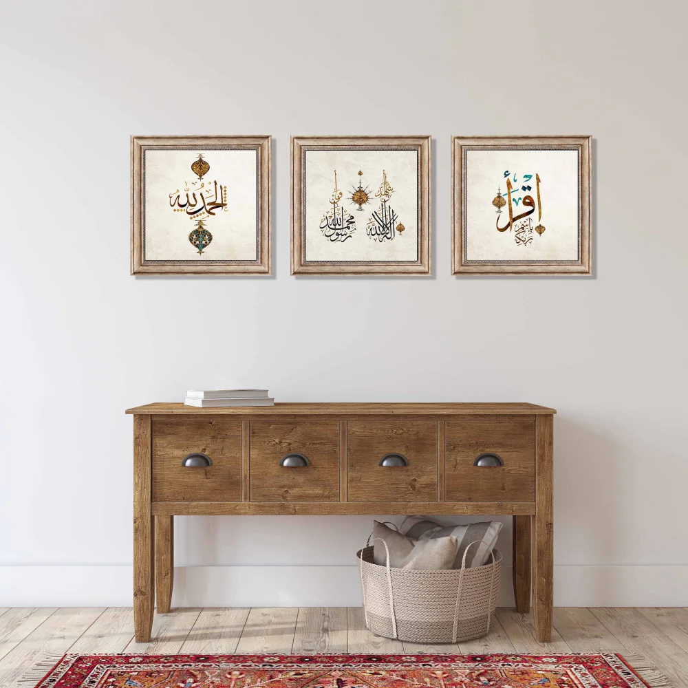 - 3 Parça Eskitme Çerçeveli İkra, Elhamdulillah ve Kelime-i Şehadet Ahşap Tablo Seti, Ev dekoru