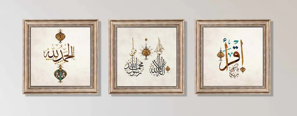 3 Parça Eskitme Çerçeveli İkra, Elhamdulillah ve Kelime-i Şehadet Ahşap Tablo Seti, Ev dekoru