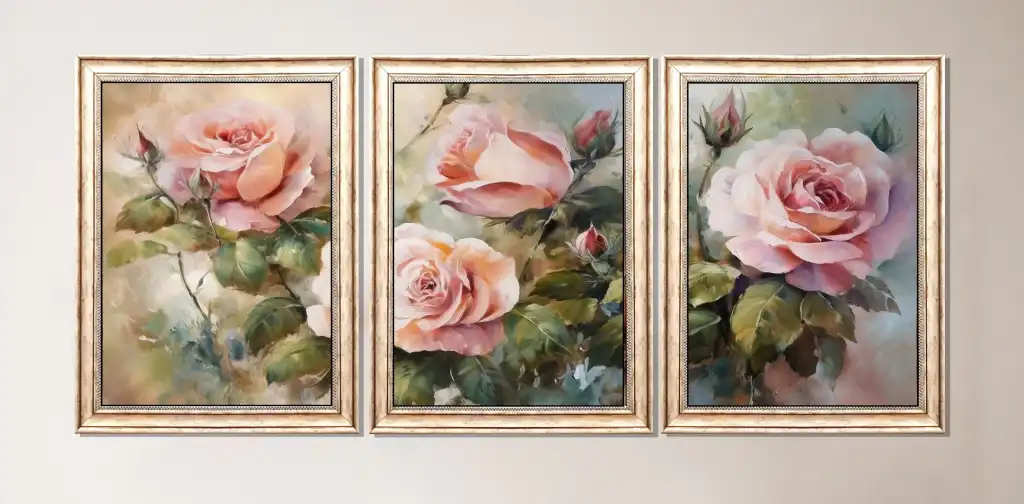 3 Parça Pembe Güller Eskitme Çerçeveli Ahşap Tablo Seti, Ev Dekoru