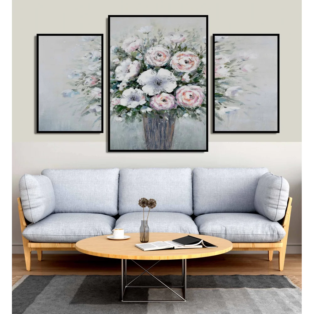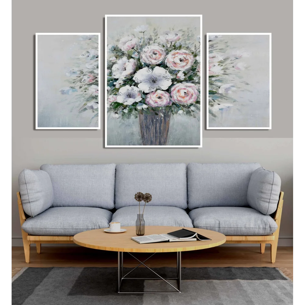 3 Parça Vazoda Dekoratif Çiçekler Çerçeveli Ahşap Tablo Seti