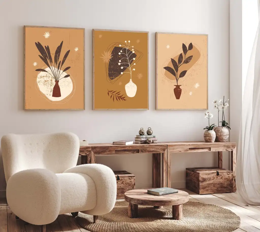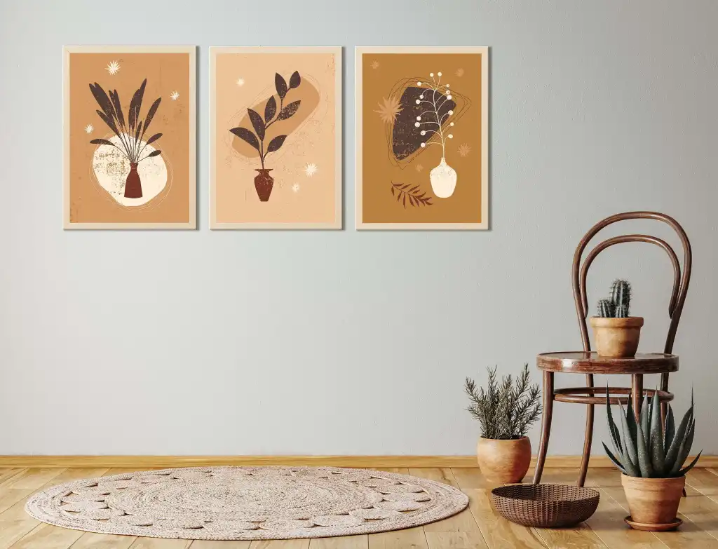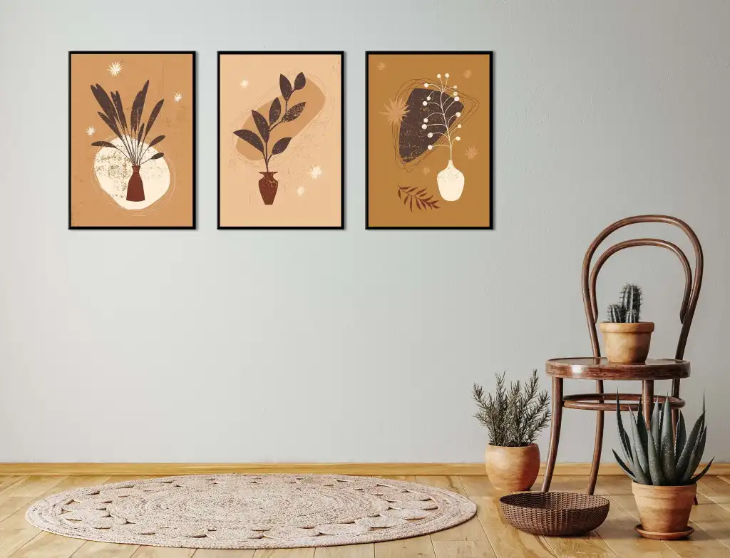 3'lü Bohemian Kahve Çerçeveli Tablo , Ev Dekoru , Soyut Tablo , Ahşap Tablo