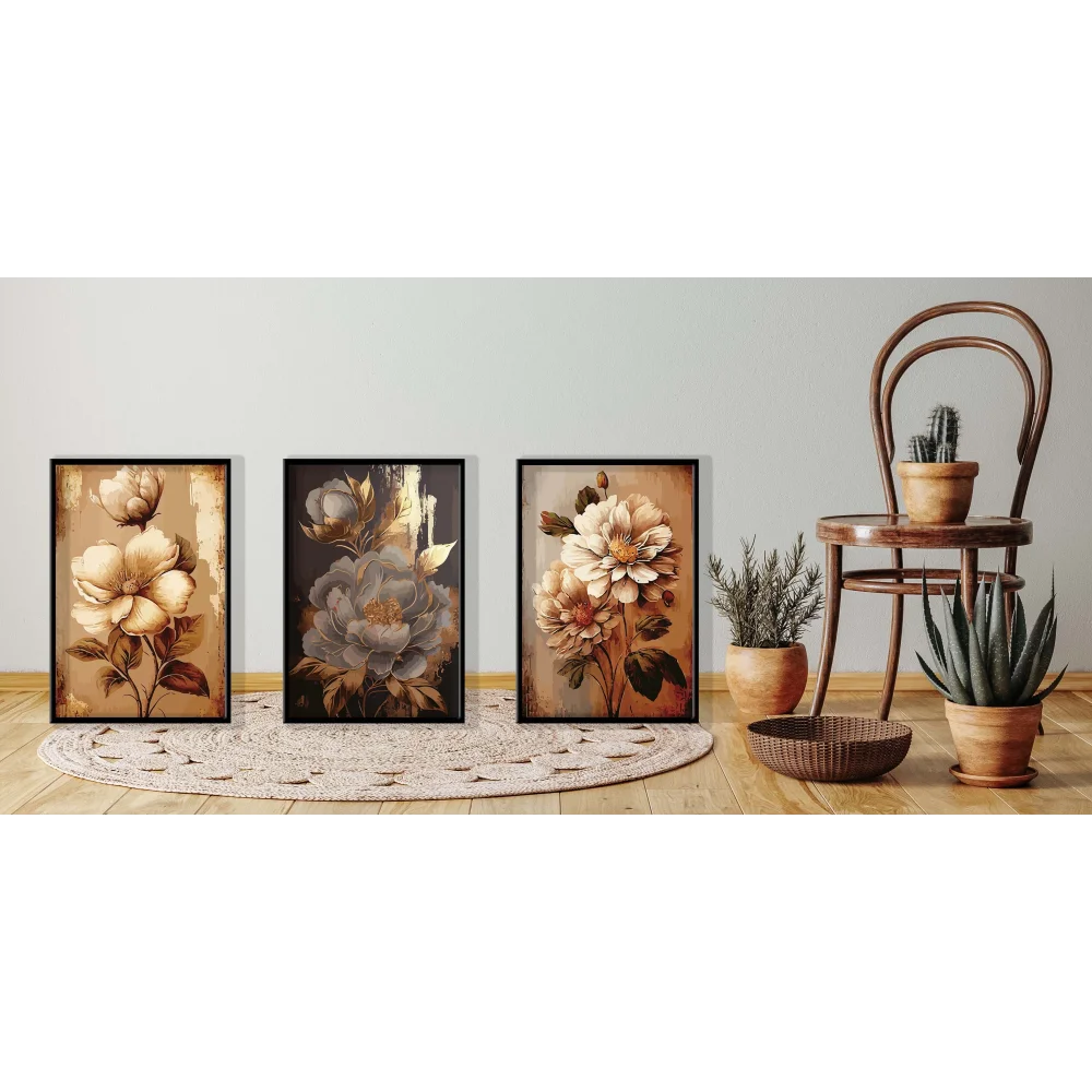 - 3'lü Dekoratif Kahve Çiçekler Çerçeveli Tablo , Ev Dekoru , Soyut Tablo , Ahşap Tablo