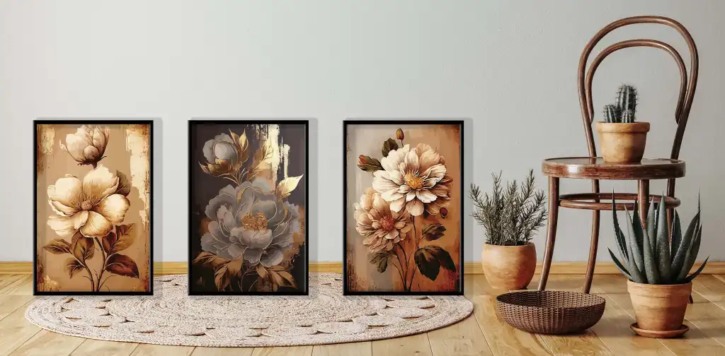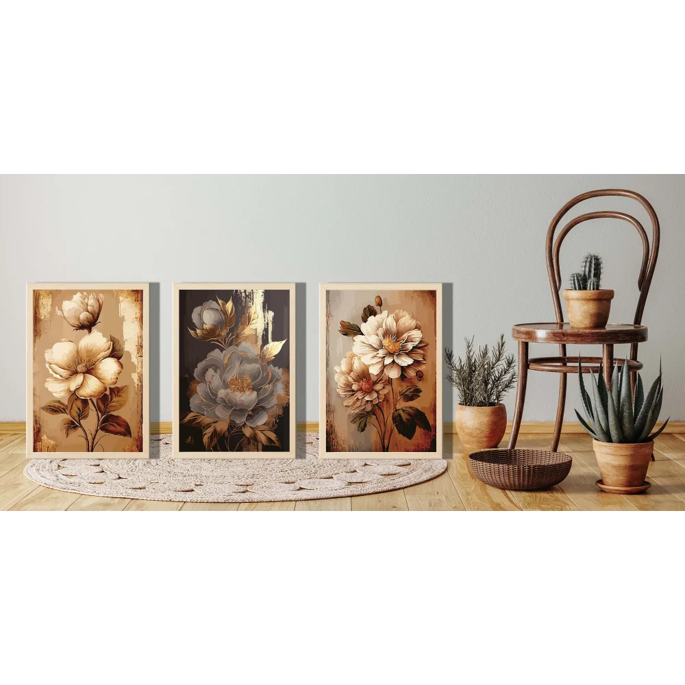 3'lü Dekoratif Kahve Çiçekler Çerçeveli Tablo , Ev Dekoru , Soyut Tablo , Ahşap Tablo