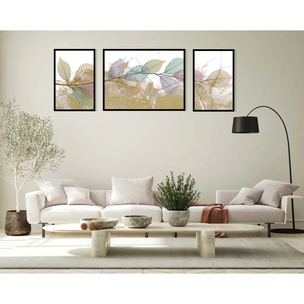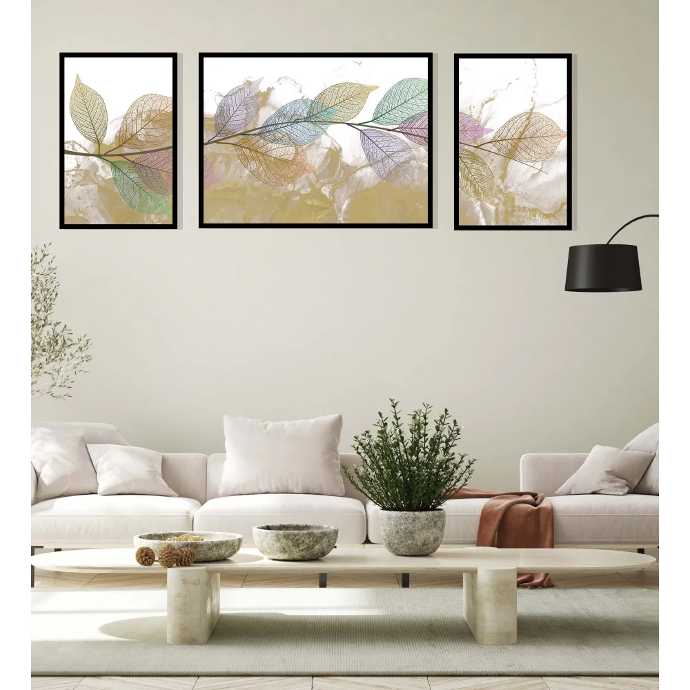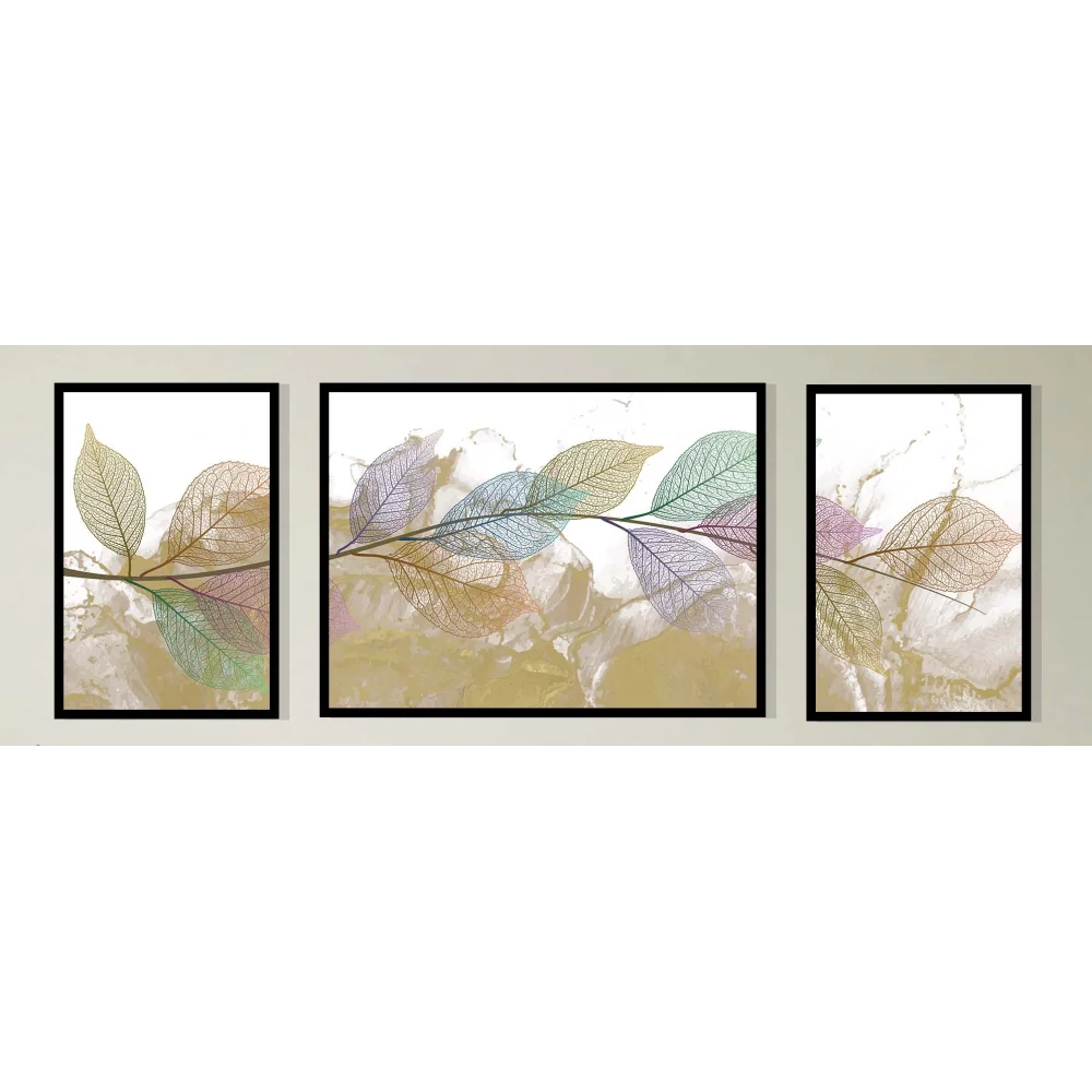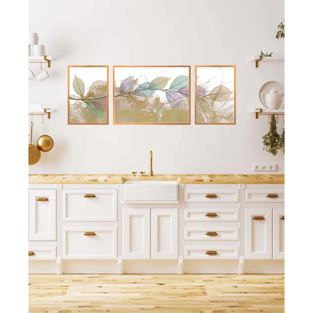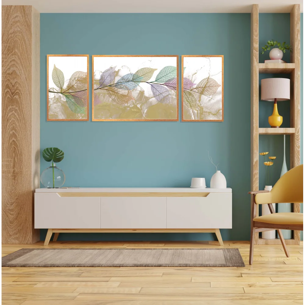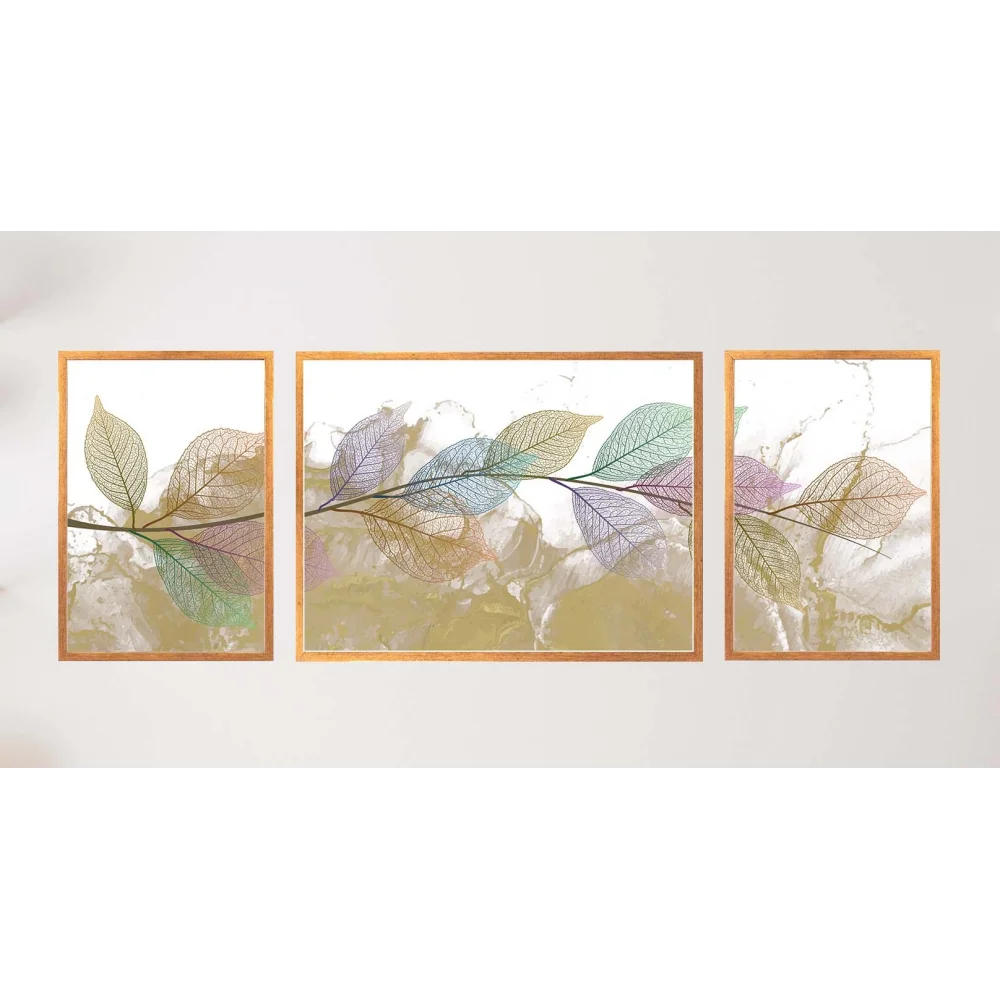 3'lü Dekoratif Yeşil Mor Yaprak Çerçeveli Tablo , Ev Dekoru , Soyut Tablo , Ahşap Tablo