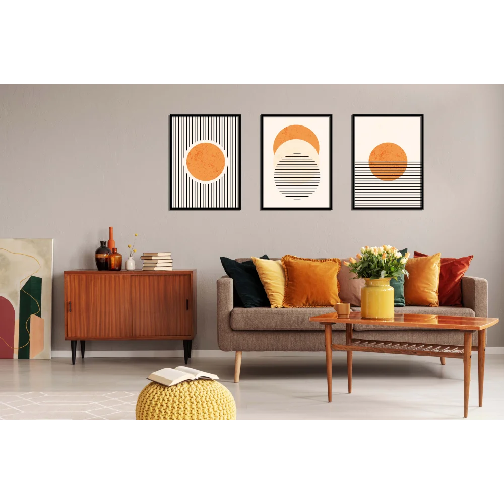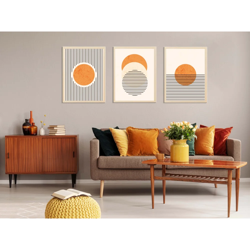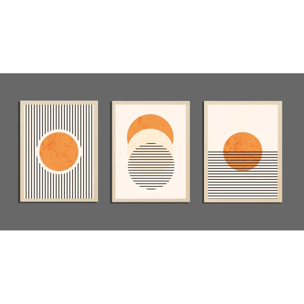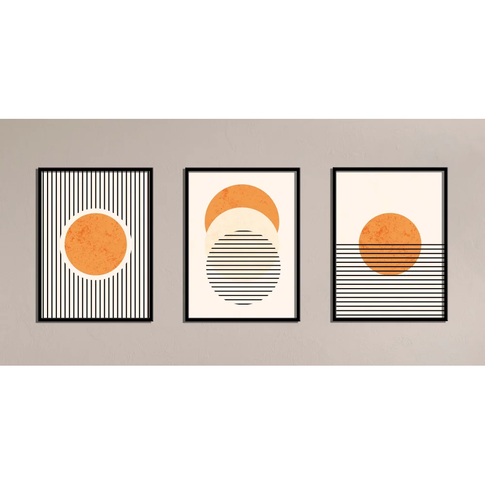 3'lü Turuncu Güneş ve Çizgiler Çerçeveli Ahşap Tablo , Ev Dekoru , Soyut Tablo , Ahşap Tablo