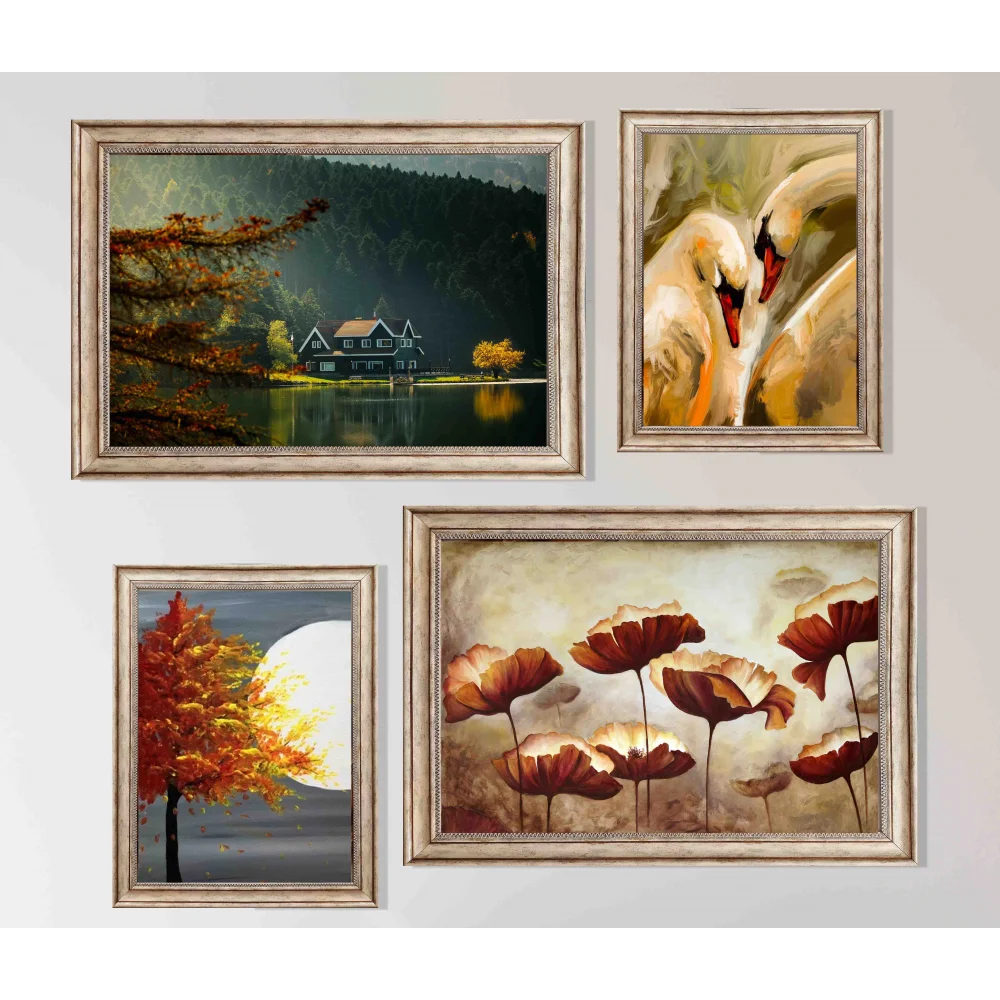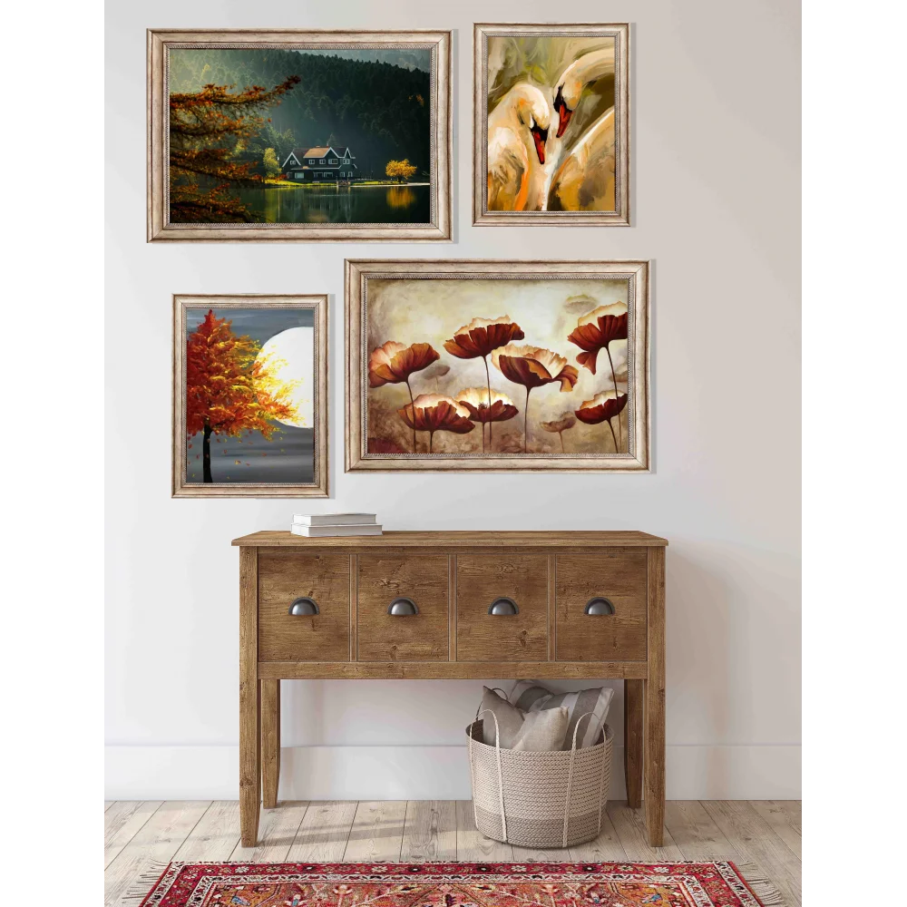 4 Parça Eskitme Çerçeveli Ahşap Tablo Seti, Ev Dekoru