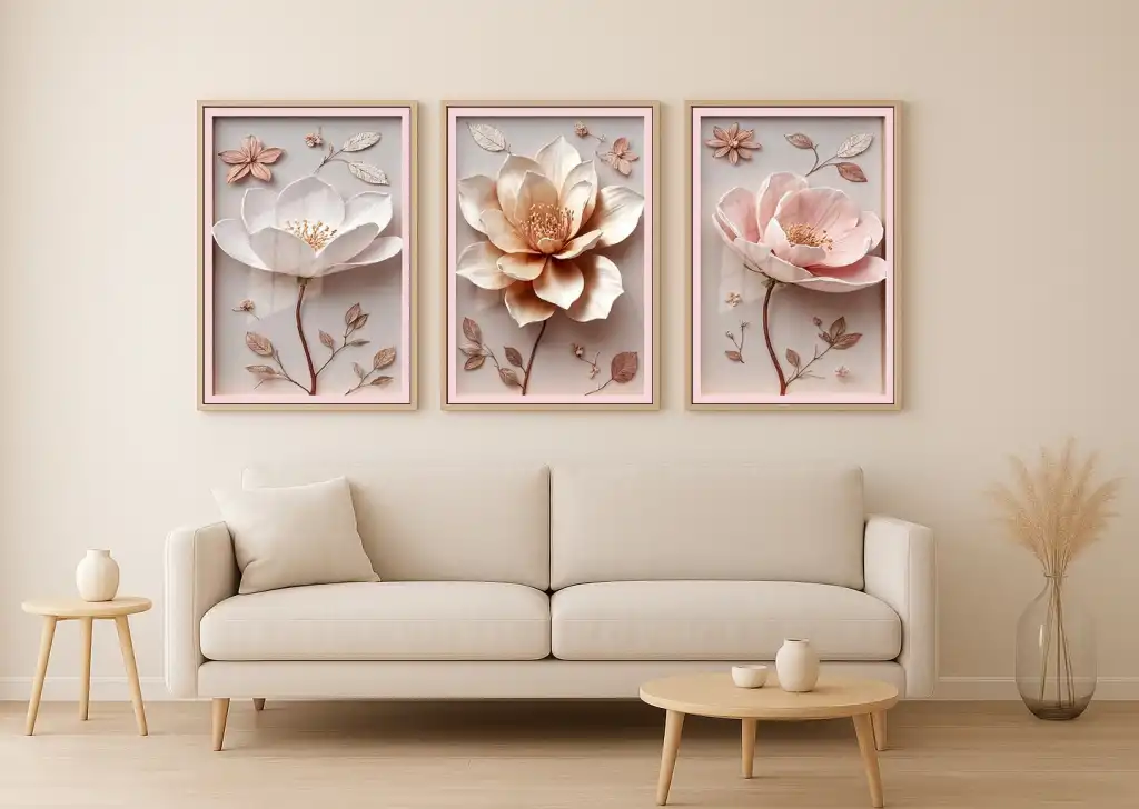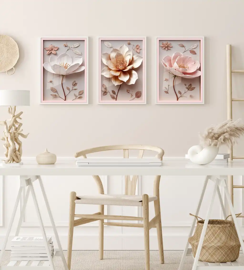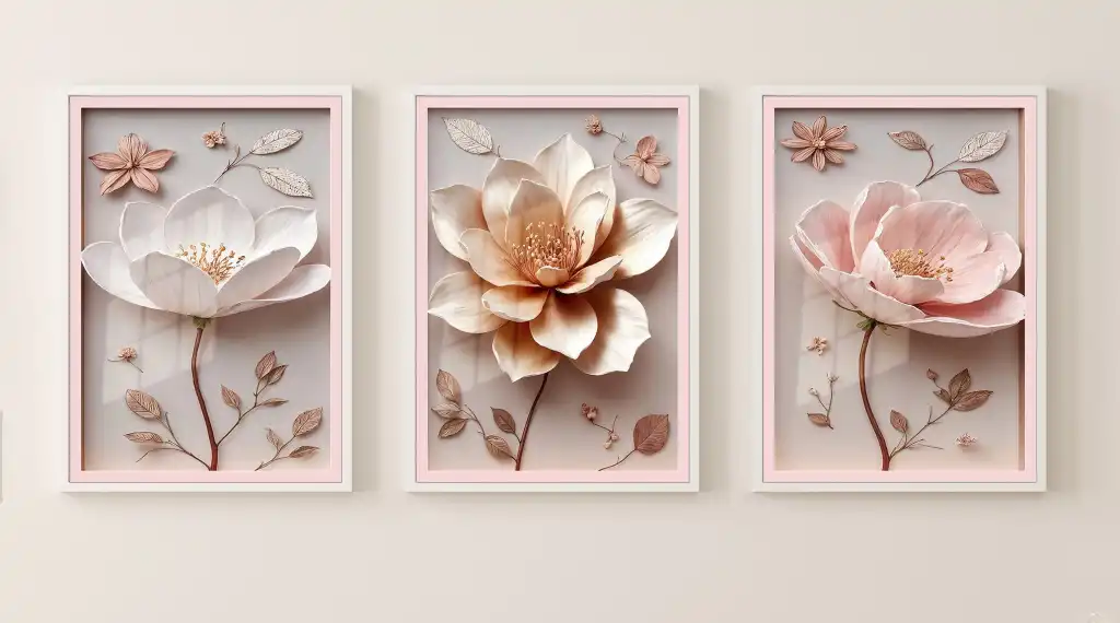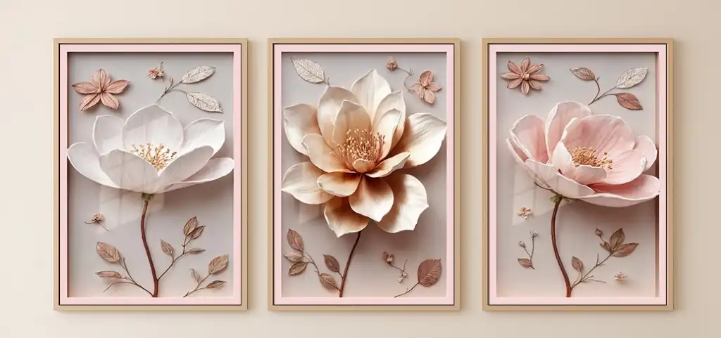 Bestablo 3 Parça Çerçeveli Kabartma Görünümlü Çiçekler Ahşap Tablo Seti, Ev Dekoru Bestablo
