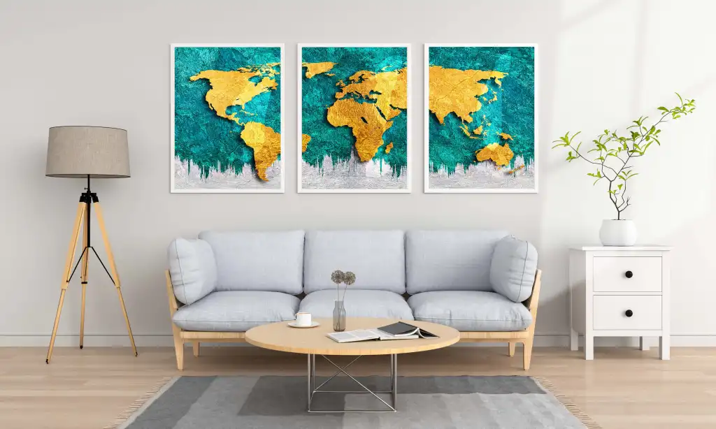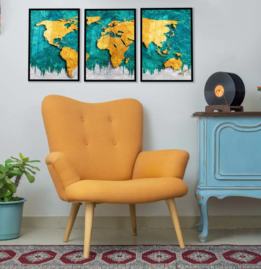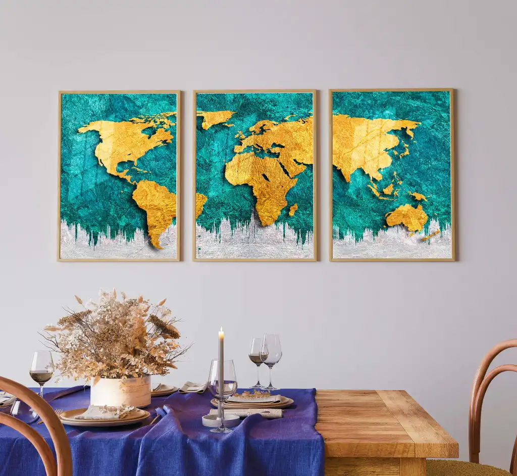 Bestablo 3 Parça Dünya Haritası Çerçeveli Ahşap Tablo Seti Bestablo
