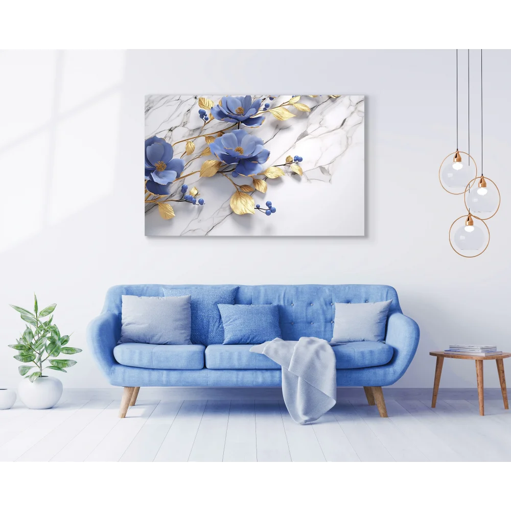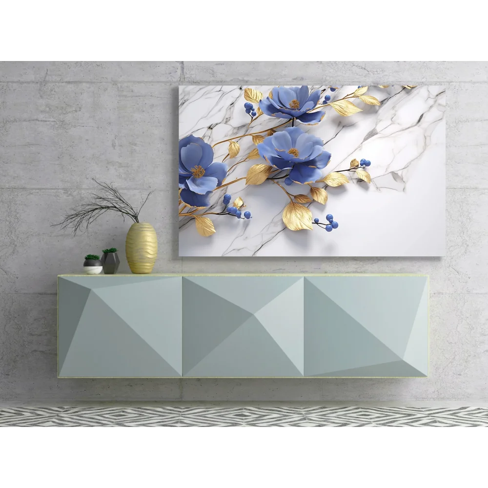 Bestablo Kabartma Görünümlü Varaklı Mavi Çiçekler Kanvas Tablo, Ev Dekoru Bestablo